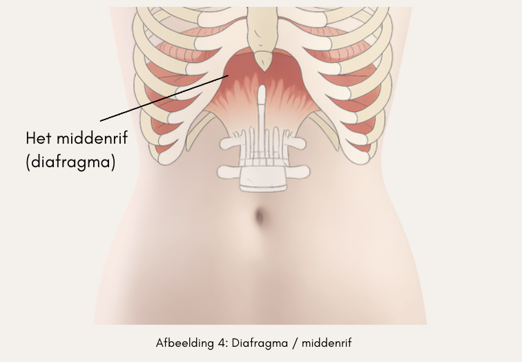 Het middenrif (diafragma) is een grote koepelvormige spier die je borst- en buikholte van elkaar scheidt.
