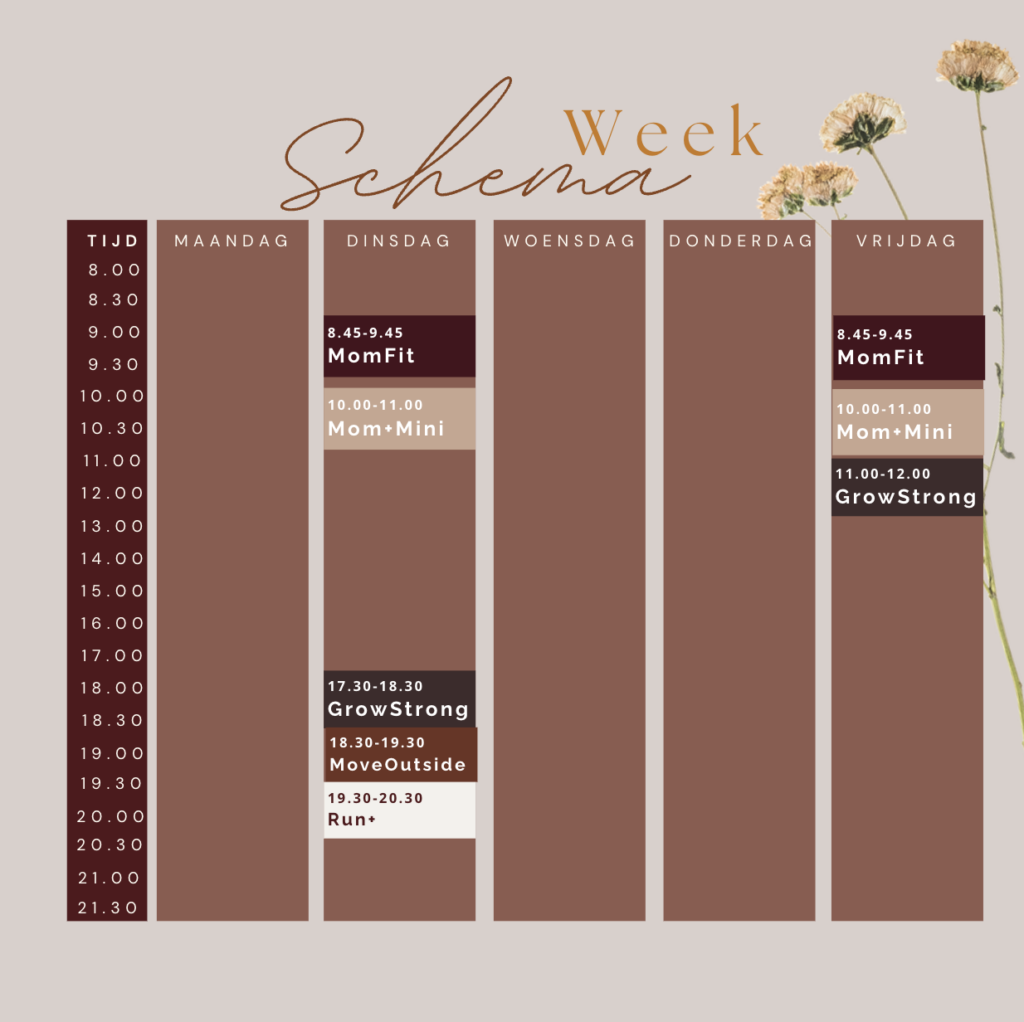 - Mom Fit (postpartum training): Dinsdag & vrijdag – 08:45–09:45
